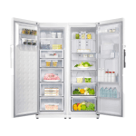 یخچال فریزر دوقلوی سام از بدنهای مقاوم با پوشش سفید ضدخش و ضدلک ساخته شده است. دربهای خوشفرم با دستگیرههای توکار، ظاهر دستگاه را یکپارچه و مدرن کردهاند. هر یک از بخشهای یخچال و فریزر دارای نمایشگر دیجیتال لمسی مجزا هستند که کنترل تنظیمات را آسانتر میکنند. فضای داخلی با طبقات شیشهای حرارتدیده و کشوهای بزرگ و عمیق طراحی شده تا استفاده از فضا بهینه شود. چراغهای LED نیز روشنایی یکنواخت و زیبایی به داخل دستگاه میبخشند.